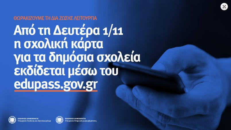 Από τη Δευτέρα 1η Νοεμβρίου 2021 τίθεται σε λειτουργία για τα δημόσια σχολεία η πλατφόρμα edupass.gov.gr, μέσω της οποίας θα εκδίδεται η Σχολική Κάρτα για COVID-19, ενώ ενσωματώνονται και όλες οι λειτουργίες του self-testing.gov.gr.